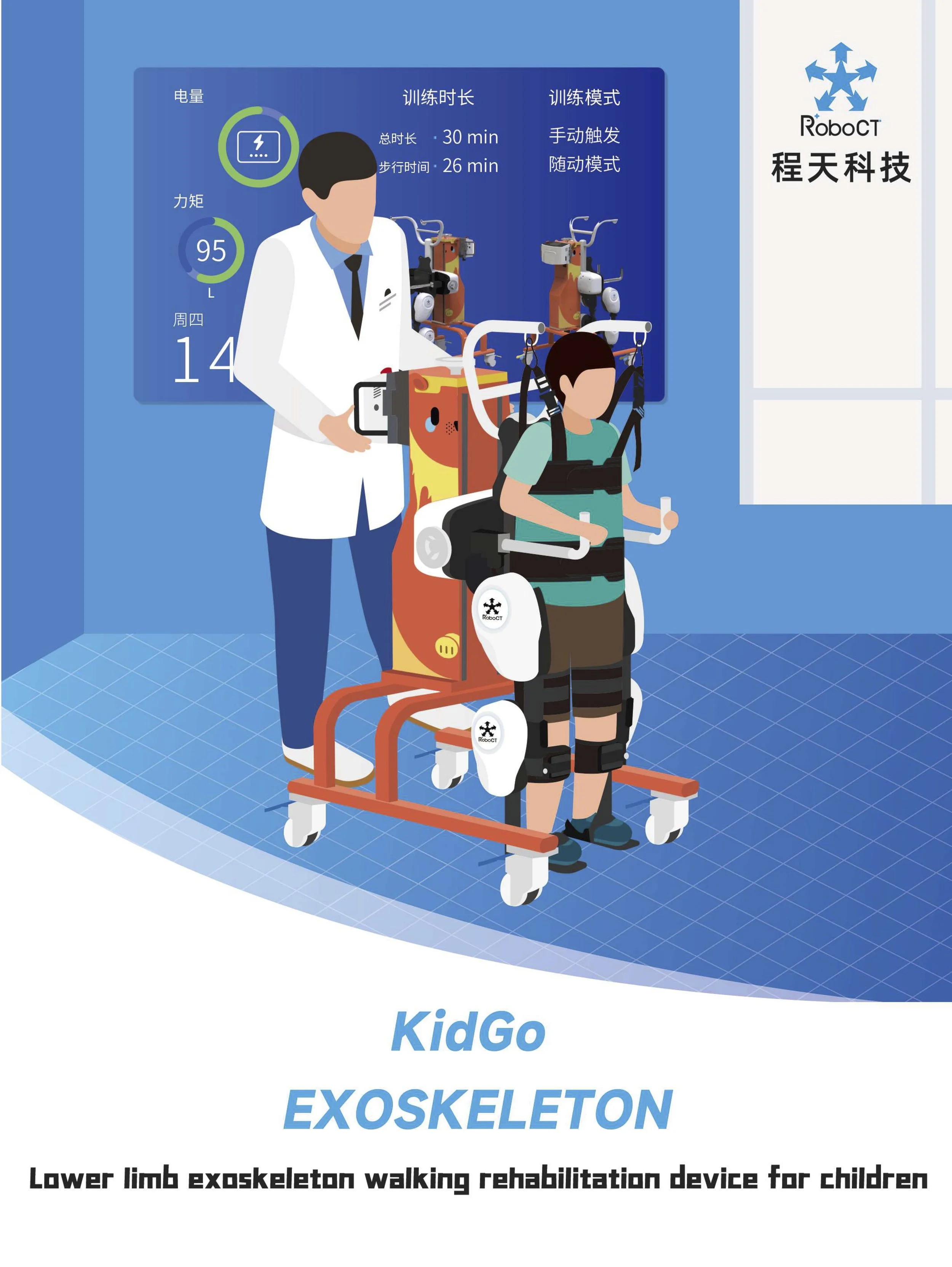 KidGo exoskeleton is an intelligent rehabilitation equipment used to improve the lower-limb function. Based on the principle of neuroplasticity, KidGo aims to stimulate proprioception, correct abnormal gait, promote brain re-learning through implanting standard walking patterns into the brain, thereby improving motor function in children with neuromuscular disease. KidGo includes different gait training patterns, like passive mode, assistive mode and active mode. In passive mode, KidGo provides all help for children to walk, and drives the children to repeat correct gait pattern. In assistive mode, KidGo will apply part of help based on the user's subjective force to complete the walk. In active mode, KidGo only plays a protective role and steps will be triggered fully depends on the user's subjective force.
